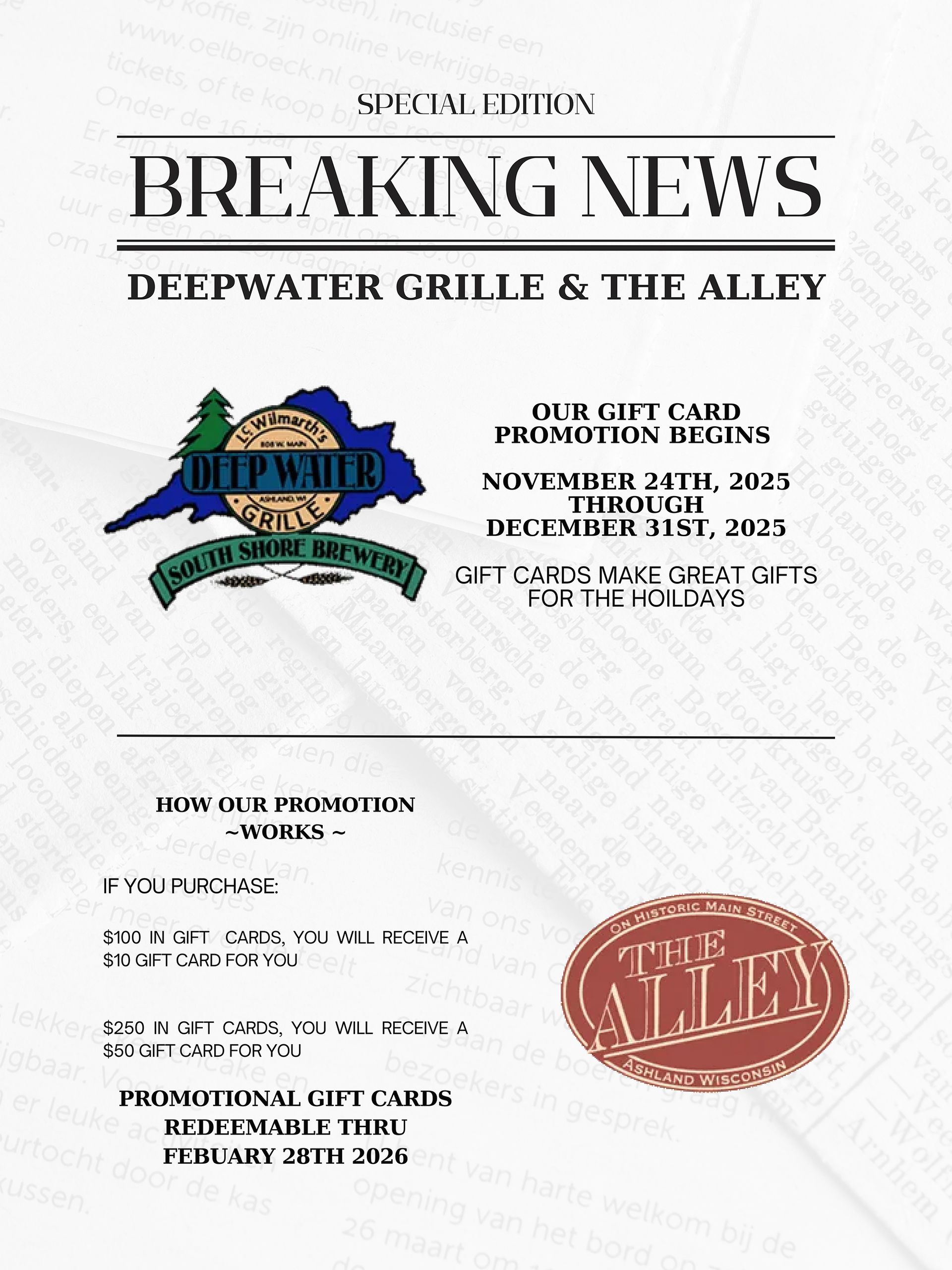 The Deep Water Grille and The Alley menus are available to go for pick up.